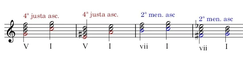 Puesto que hay una dominante, debe haber una tónica que la siga. La relación dominante tónica es de una cuarta ascendente entre sus fundamentales si es un acorde de dominante con el Vº como fundamental o de 1/2 tono ascendente si la dominante tiene a la sensible como fundamental (ver la tabla de arriba).