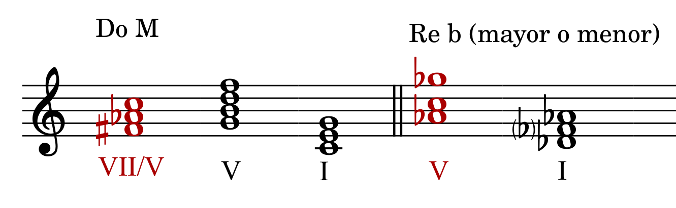 En el ejemplo previo, puedes observar una modulación armónica mediante el uso de la sexta aumentada alemana. El acorde de sexta aumentada en Do mayor desempeña el papel de dominante de la dominante. Cuando trasladamos la nota del bajo hacia arriba (Fa #) y la transformamos en séptima (Sol b) obtienes un acorde de séptima dominante en la tonalidad de Re bemol, ya sea mayor o menor.